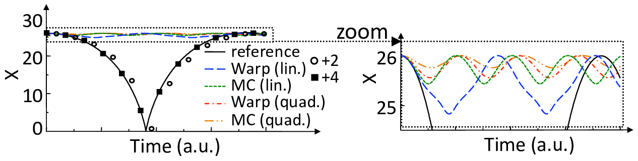 The presence of the self-force is illustrated on a simple test case that was introduced in Vay et al. [1] and also used in Colella and Norgaard [2]: a single macroparticle is initialized at rest within a single refinement patch four cells away from the patch refinement boundary. The patch at level \(L_1\) has \(32\times32\) cells and is centered relative to the lowest \(64\times64\) grid at level \(L_0\) (“main grid”), while the macroparticle is centered in one direction but not in the other. The boundaries of the main grid are perfectly conducting, so that the macroparticle is attracted to the closest wall by its image. Specular reflection is applied when the particle reaches the boundary so that the motion is cyclic. The test was performed with WarpX using either linear or quadratic interpolation when gathering the main grid solution onto the refined patch boundary. It was also performed using another method from P. McCorquodale et al (labeled “MC” in this paper) based on the algorithm given in Mccorquodale et al. [5], which employs a more elaborate procedure involving two-ways interpolations between the main grid and the refined patch. A reference case was also run using a single \(128\times128\) grid with no refined patch, in which it is observed that the particle propagates toward the closest boundary at an accelerated pace, is reflected specularly at the boundary, then slows down until it reaches its initial position at zero velocity. The particle position histories are shown for the various cases in Fig. 41. In all the cases using the refinement patch, the particle was spuriously reflected near the patch boundary and was effectively trapped in the patch. We notice that linear interpolation performs better than quadratic, and that the simple method implemented in WarpX performs better than the other proposed method for this test (see discussion below).